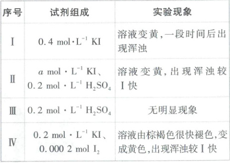 8.D【解析】I⁻为催化剂,将ⅰ+ⅱ×2消去I⁻、I₂,可得反应的化学方程式:$3SO₂+2H₂O\frac{\underline{I^-}}{=}S↓+2H₂SO₄,$A正确;Ⅱ是I的对比实验,所用c(KI)应该相等,否则无法得出正确结论,故a=0.4,B正确;比较Ⅰ、Ⅱ、Ⅲ可得出结论:I⁻是SO₂歧化反应的催化剂,H⁺单独存在时不具有催化作用,但有I⁻存在时H⁺可以加快SO₂歧化反应的速率,C正确;实验表明,SO₂的歧化反应速率:Ⅳ>I,结合I、Ⅱ反应速率不同的原因(氢离子使反应速率加快),可知Ⅳ中由反应ⅱ产生的氢离子使反应速率加快,反应ⅱ比ⅰ快,D错误。