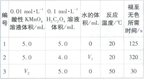 (3)实验1、2探究草酸溶液的浓度对化学反应速率的影响,根据实验1可知溶液的总体积V=5.0mL+5.0mL=10.0mL,则V₁=10.0-5.0-4.0=1.0,V₂=10.0-5.0=5.0;实验1、3中除了反应温度不同,其余条件均相同,则探究的是反应温度对反应速率的影响。