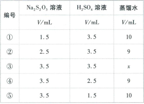 [解析]题给反应有S单质生成,故随反应进行,生成的S越多,溶液浑浊度越大。加热,反应速率增大,在加热条件下进行实验①,可缩短到达相同浑浊度所需的时间,则浑浊度曲线应在曲线①左边,其浑浊度曲线应变为a,A不符合题意;③④⑤变量为H₂SO₄的浓度,根据变量控制法的要求有3.5 + 2.5 + 9 = 3.5 + 3.5 + x,则实验③中x=8,B不符合题意;实验①②③变量为硫代硫酸钠溶液的浓度,实验③④⑤变量为硫酸的浓度,由题图可知,达到相同浑浊度所需的时间:③<④<⑤<②<①,可说明其他条件相同时,增大或降低硫代硫酸钠溶液的浓度和硫酸的浓度,对该反应化学反应速率影响程度不同,C符合题意;实验①②③或③④⑤均可说明其他条件相同时,增大反应物浓度,可缩短达到相同浑浊度所需的时间,即可增大该反应速率,D不符合题意。
