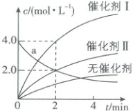 [解析]由图可知,无催化剂时,随反应进行,生成物浓度在增加,说明反应也在进行,A错误;由图可知,相同时间内,催化剂Ⅰ作用下生成物浓度增大更多,说明催化剂Ⅰ使反应活化能更低,反应更快,催化剂Ⅰ比催化剂Ⅱ催化效果好,B错误;由图可知,使用催化剂Ⅱ时,在0~2min内Δc(Y)=2.0mol·L⁻¹,而a曲线表示的X的浓度变化量也为2.0mol·L⁻¹,二者变化量之比不等于化学计量数之比,所以a曲线不表示使用催化剂Ⅱ时X的浓度随时间t的变化,C错误;使用催化剂Ⅰ时,在0~2min内,Y的浓度变化了4.0mol·L⁻¹,则v(X)=$\frac{1}{2}$v(Y)=$\frac{1}{2}$×$\frac{4.0}{2}$mol·L⁻¹·min⁻¹=1.0mol·L⁻¹·min⁻¹,D正确。