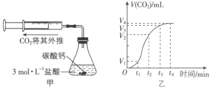 4. 某同学用图甲所示装置及器材,测定碳酸钙与一定体积的盐酸反应生成$CO_{2}$的体积$[V(CO_{2})]$随反应时间的变化情况,并绘制出图乙所示曲线。有关分析不正确的是(