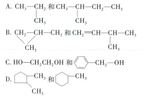 —CH₂—OH只含一个—OH,结构不相似,二者不互为同系物,C错误; 和 的分子式均为C₇H₁₄,二者互为同分异构体而非同系物,D错误。