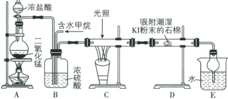 12.D [解析]A装置中盛放浓盐酸的仪器名称是分液漏斗,A正确;A装置制备的氯气中含有水蒸气,且通入B装置的甲烷气体中也含有水蒸气,浓硫酸可以吸水,同时将甲烷与氯气均匀混合,还可以通过观察导管口的气泡判断气流速度,B正确;C装置中氯气与甲烷在光照条件下发生取代反应,生成一氯甲烷、二氯甲烷、三氯甲烷、四氯化碳以及氯化氢,产物共五种,C正确;E装置除了有盐酸外,还含有液态有机物,盐酸与有机物互不相溶,分层,从E中分离出盐酸的操作为分液,D错误。