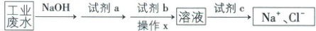 9.B 【解析】废水中只有Cu²⁺可以和NaOH反应,NaOH的作用是除去Cu²⁺,A正确;试剂a为BaCl₂,试剂b为Na₂CO₃,碳酸钠用于除去过量钡离子,B错误;题给流程图中操作x为过滤,滤液中含Na⁺、Cl⁻、CO₃²⁻、OH⁻,试剂c为稀盐酸,可除去CO₃²⁻、OH⁻,C正确;检验SO₄²⁻是否除尽,可取适量待测溶液,先加入盐酸,再加入BaCl₂溶液,如果没有白色沉淀生成,说明已经除尽,D正确。