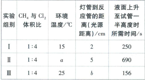 (3)①实验探究时应采用变量控制法,遵循单一变量原则,根据表中信息可知,实验Ⅰ和Ⅱ光源距离不同,则应是探究光源距离对反应速率的影响,控制实验Ⅰ和Ⅱ的环境温度相同,a=15。②实验Ⅰ和Ⅲ温度不同,应是探究环境温度对反应速率的影响,应控制实验Ⅰ和Ⅲ的光源距离相等,b=2。③液面上升至试管一半高度所需时间越短,反应速率越快,则根据表中三组实验得到结论:其他条件相同时,环境温度越高,光源距离越近,甲烷与氯气反应速率越快。