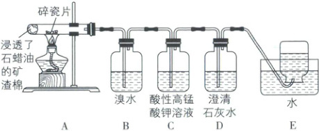 [解析]加热碎瓷片,温度高,其可调节热量,石蜡油附着在高温的碎瓷片上发生分解,A正确;除去甲烷中混有的乙烯一般选用溴水,不用溴的CCl₄溶液,因为甲烷能溶于CCl₄,B错误;C中高锰酸钾会和乙烯发生氧化还原反应,乙烯被氧化为二氧化碳,所给离子方程式正确,C正确;E收集未反应完的乙烯,防止污染空气,D正确。