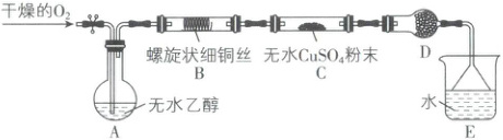 (4)实验开始后,Cu在干燥的$\mathrm{O_2}$中加热先被氧化为CuO,CuO再和乙醇气体反应生成Cu、乙醛和水,反应中有水生成,则可以看到装置C中的无水$\mathrm{CuSO_4}$粉末变为蓝色。