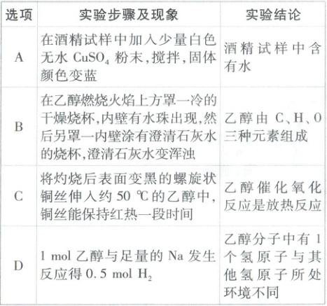 3.B 【解析】无水硫酸铜与水反应生成的五水合硫酸铜呈蓝色,无水硫酸铜不与酒精反应且不溶于酒精,可以用无水硫酸铜检验酒精中是否含有水,如有水,则固体会变蓝,A正确;在乙醇燃烧火焰上方罩一冷的干燥烧杯,烧杯内壁有水珠出现,说明乙醇分子中含有H元素,另罩一内壁涂有澄清石灰水的烧杯,澄清石灰水变浑浊,说明乙醇分子中含有C元素,但燃烧消耗氧气,不能确定乙醇中是否含有O元素,B错误;将灼烧后表面变黑的螺旋状铜丝伸入约$50\ \mathrm{^{\circ}C}$的乙醇中,铜丝能保持红热一段时间,说明反应放热,C正确;$1\ \mathrm{mol}$乙醇与足量的钠发生反应得到$0.5\ \mathrm{mol}$氢气,说明1个乙醇分子中有1个氢原子可与金属钠反应生成氢气,其余氢原子不参与反应,则有1个氢原子与其他氢原子所处环境不同,D正确。