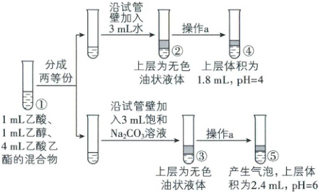 6.D 【解析】由图可知,①中混合溶液不分层说明乙酸、乙醇溶于乙酸乙酯,A正确;乙酸乙酯不溶于水,乙酸和乙醇溶于水,由图可知,经过“操作a”后,试管内分层情况与刚加入水或Na₂CO₃溶液时不同,则“操作a”为振荡、静置,使可溶于水的物质充分溶于水,B正确;④⑤pH不同是因为碳酸钠溶液能与醋酸溶液反应生成醋酸钠、二氧化碳和水,反应的化学方程式为Na₂CO₃+2CH₃COOH=2CH₃COONa+CO₂↑+H₂O,C正确;④⑤pH不同及上层体积不同,说明饱和碳酸钠溶液可以降低乙酸乙酯的溶解度,且更有利于除去乙酸乙酯中的乙酸,D错误。