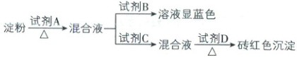 [解析]淀粉在稀硫酸作用下发生水解,将混合液分为两份,其中一份中加入试剂B,溶液显蓝色,根据淀粉遇碘单质变蓝,推测出试剂B为碘水,另一份中加入氢氧化钠溶液,使溶液呈碱性,然后加入新制氢氧化铜,加热,出现砖红色沉淀,因此A、B、C、D分别为稀硫酸、碘水、氢氧化钠溶液、新制氢氧化铜,选A。