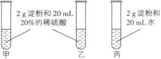 (3)试管甲和乙中均加入了2g淀粉和20mL20%的稀硫酸,试管甲用60~80℃的水浴加热5~6min,试管乙不加热,所以设计甲和乙是为了探究温度对淀粉水解的影响;试管甲和丙中均加入了2g淀粉,与甲对比,试管丙中未加20mL20%的稀硫酸,而是加入了20mL水,试管甲和丙均用60~80℃的水浴加热5~6min,所以设计甲和丙是为了探究催化剂对淀粉水解的影响。