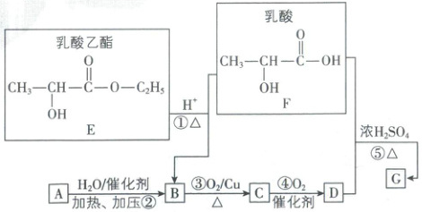 思路导引:Ⅱ.乳酸乙酯发生水解得到乳酸和B($CH_{3}CH_{2}OH$),烃A的产量是衡量一个国家石油化工发展水平的重要标志,A为乙烯,与水发生加成反应得到B($CH_{3}CH_{2}OH$),B发生催化氧化得到C($CH_{3}CHO$),C发生催化氧化得到D($CH_{3}COOH$),乳酸与D发生酯化反应得到G($CH_{3}CHCOOH\vertOOCCH_{3}$)。