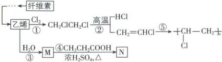 7.B [解析]乙烯和水发生加成反应生成乙醇,M是乙醇;乙醇和丙酸发生酯化反应生成丙酸乙酯,N是丙酸乙酯。纤维素水解的最终产物为葡萄糖,A正确。①③为加成反应,④为取代反应,B错误。M是乙醇,官能团为羟基,C正确。反应⑤的产物是聚氯乙烯,可以用于制成薄膜、管道、绝缘材料等,D正确。