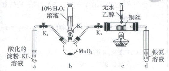 【实验剖析】b 装置制备 $O_2$,a 装置中碘离子被 $O_2$ 氧化成碘单质,淀粉溶液遇 $I_2$ 变蓝,c 装置先发生铜丝的氧化反应,滴入乙醇后,发生乙醇的催化氧化反应生成乙醛,d 装置中乙醛与银氨溶液在水浴加热中可以生成银镜。