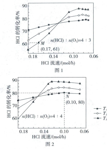 (1)根据题干中方程式,反应前气体系数大于反应后气体系数,属于熵减反应,即$\Delta S<0$;根据题意较低流速下的转化率可近似为平衡转化率,因此从图1可以看出,较低流速下,HCl转化率大小为$\alpha(T_{1})<\alpha(T_{2})<\alpha(T_{3})$,由于反应放热,因此升温HCl平衡转化率下降,所以$T_{3}$为低温,$T_{3}=360^{\circ}C$。
