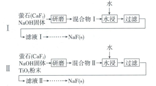 。(3)工艺Ⅰ中研磨引发的固相反应为${CaF_{2} +2NaOH\xlongequal{}Ca(OH)_{2} +2NaF}$。分析混合物Ⅰ,测得反应的转化率为$78\%$。水浸分离,${NaF}$的产率仅为$8\%$。
