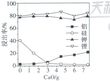 ②一定条件下,元素浸出率与${CaO}$用量的关系如图,为提高锂浸出率,${CaO}$最佳用量为_______$g$。(保留小数点后一位)