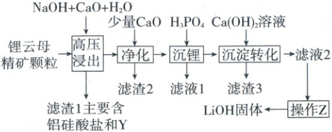 锂云母精矿颗粒$\xrightarrow[高压浸出]{NaOH+CaO+H_{2}O}$滤渣1主要含铝硅酸盐和Y$\xrightarrow[少量CaO]{净化}$滤渣2$\xrightarrow[沉锂]{H_{3}PO_{4}}$滤液1