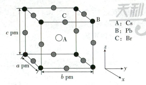 $(5) $某含$Pb$化合物是一种被广泛应用于太阳能电池领域的晶体材料,室温下该化合物晶胞如图所示,晶胞参数$a≠b,$$\alpha =\beta =\gamma =90°。$$Cs$与$Pb$之间的距离为__________ pm (用带有晶胞参数的代数式表示$);$该化合物的化学式为__________ M_{c_{s}}M_{p_{b}}和德罗常数$N_{A}$的代数式表示,质量$)。$