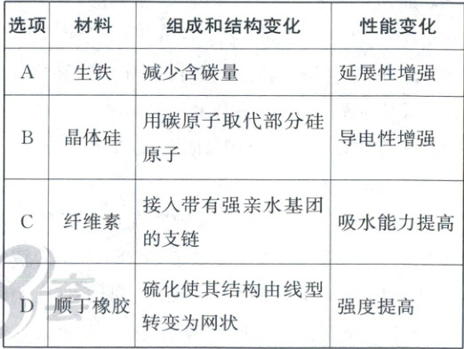 6.D 物质的结构与性质、有机高分子 较低的碳含量赋予材料更好的延展性和可塑性,A正确;晶体硅是半导体,若用碳原子取代部分硅原子,部分Si—Si变成C—Si,键长减小,键能增大,材料的硬度会提高,但导电性不会增加,B错误;纤维素接上带有强亲水基团的支链,可以提高吸水能力,C正确;在橡胶中加入硫化剂和促进剂等交联助剂,使线型结构转变为网状结构,网状结构相对线型结构具有更大的强度,D正确。