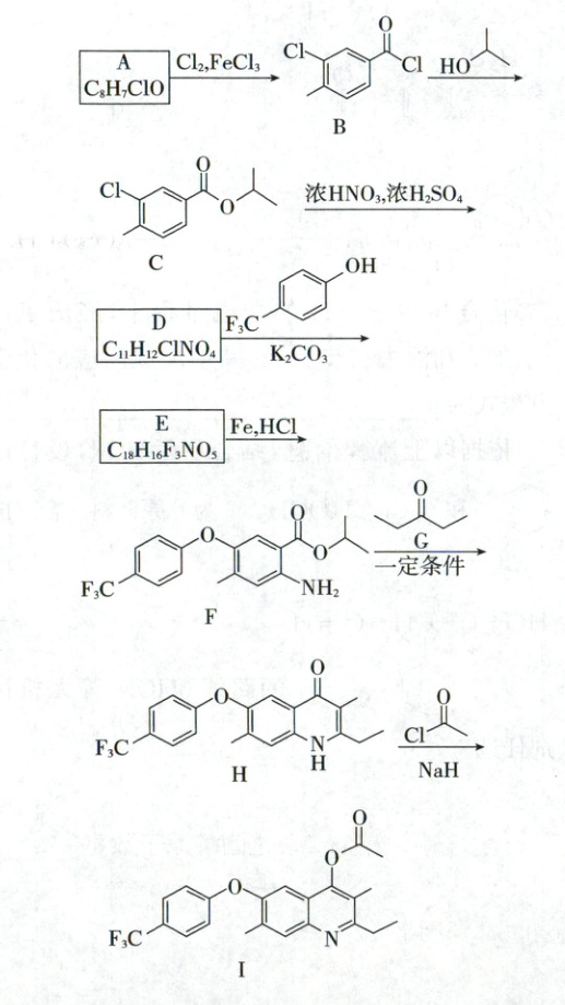(5)由F生成H的反应中可能生成中间体J,已知J的分子式为${C_{23}H_{26}F_{3}NO_{3}}$,则J的结构简式为_______(写出一种即可)。
