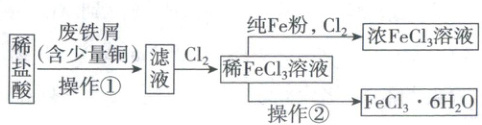(4) 为增大${FeCl_{3}}$溶液的浓度,向稀${FeCl_{3}}$溶液中加入纯${Fe}$粉后通入${Cl_{2}}$。此过程中发生的主要反应的离子方程式为_______。