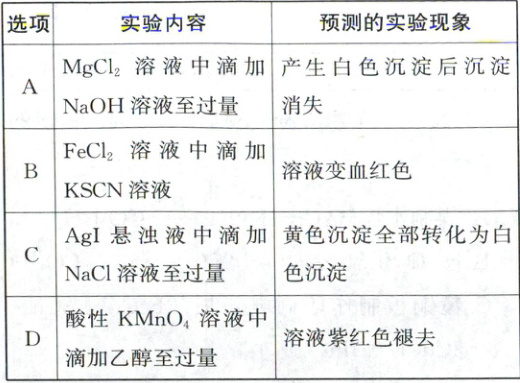 6.D 实验现象 $MgCl_2$溶液中滴加氢氧化钠溶液时,发生反应:$Mg^{2+} + 2OH^-\xlongequal{}Mg(OH)_2\downarrow$,产生白色沉淀。氢氧化钠溶液过量时,$Mg(OH)_2$沉淀不溶解,A错误;$SCN^-$与$Fe^{3+}$反应生成红色络合物,而与$Fe^{2+}$不反应,故无现象,B错误;由于$K_{sp}(AgI) < K_{sp}(AgCl)$,$AgI$悬浊液中滴加$NaCl$溶液至过量,黄色沉淀不能全部转化为白色沉淀,C错误;乙醇有还原性,可被酸性高锰酸钾溶液氧化为乙酸,所以酸性高锰酸钾溶液中滴加过量乙醇,溶液紫红色褪去,D正确。