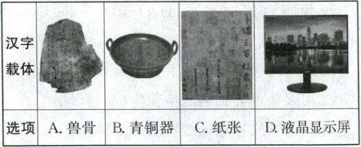 5. 【传统文化】(2022·广东卷,2分)中华文明源远流长,在世界文明中独树一帜,汉字居功至伟。随着时代发展,汉字被不断赋予新的文化内涵,其载体也发生相应变化。下列汉字载体主要由合金材料制成的是 (