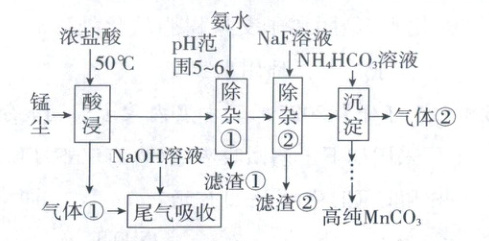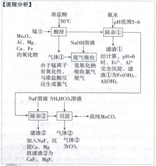 3.【生产环保】(2023·河北卷,3分)一种以锰尘(主要成分为${Mn_{3}O_{4}}$,杂质为铝、镁、钙、铁的氧化物)为原料制备高纯${MnCO_{3}}$的清洁生产新工艺流程如下: