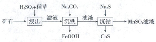 1.C从高锰钴矿中提取金属元素的工艺流程 硫酸可催化稻草中的纤维素等水解产生还原性物质,硫酸提供酸性环境,促进金属氧化物溶解,A正确;使用生物质的优点是其来源广泛且可再生,B正确;由流程图可知,“浸出”时Co和Mn被还原,Fe未被还原,C错误;“沉钴”后上层清液为CoS饱和溶液,存在$c(Co^{2+})· c(S^{2-}) = 10^{-20.4}$,D正确。