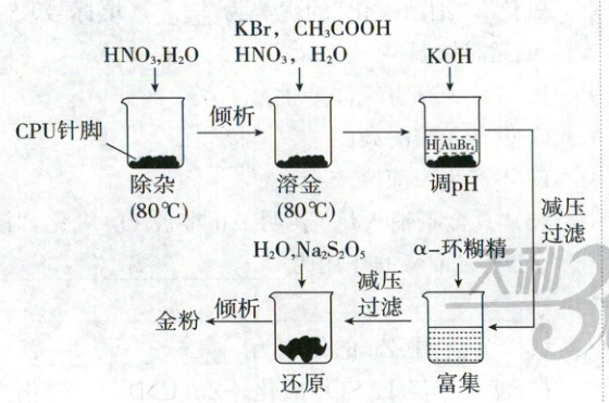 2.C从CPU针脚中回收金的实验 将CPU针脚粉碎可增大反应物的接触面积,加速溶解,A正确;除杂和溶金步骤中均涉及硝酸参与的氧化还原反应,有氮氧化物生成,需在通风橱中进行,B正确;第二次减压过滤后得到的物质经还原、倾析后得到金粉,则富集后$\mathrm{K[AuBr_4]}$主要存在于滤渣中,C错误;还原步骤中$\mathrm{Na_2S_2O_3}$作还原剂,S元素化合价由+4价升高到+6价,则还原步骤中有$\mathrm{SO_4^{2-}}$生成,D正确。