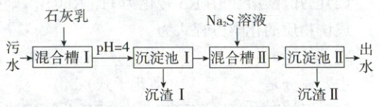 4.D工艺流程 调pH = 4后,根据表中数据可知,$\mathrm{Fe^{3+}}$会完全沉淀,$\mathrm{Al^{3+}}$会部分沉淀,则沉渣I中含有$\mathrm{Fe(OH)_3}$和$\mathrm{Al(OH)_3}$,A项正确;$\mathrm{Na_2S}$溶液中$\mathrm{S^{2-}}$水解使得溶液呈碱性,水解方程式为$\mathrm{S^{2-} + H_2O \rightleftharpoons HS^- + OH^-}$,B项正确;“沉淀池II”中,当$\mathrm{Cu^{2+}}$和$\mathrm{Zn^{2+}}$完全沉淀时,溶液中$\frac{c(\mathrm{Cu^{2+}})}{c(\mathrm{Zn^{2+}})} = \frac{c(\mathrm{Cu^{2+}}) · c(\mathrm{S^{2-}})}{c(\mathrm{Zn^{2+}}) · c(\mathrm{S^{2-}})} = \frac{K_{sp}(\mathrm{CuS})}{K_{sp}(\mathrm{ZnS})} = 4.0 × 10^{-12}$,C项正确;阴离子交换树脂在溶液中能以氢氧根离子交换溶液中的阴离子,从而达到处理水中阴离子的目的,但“出水”中还含有$\mathrm{Al^{3+}}$等阳离子,故不可用作工业冷却循环用水,D项错误。