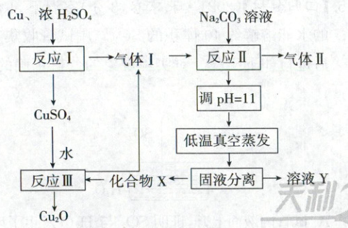 【流程分析】Cu与浓硫酸发生反应,反应Ⅰ为Cu + 2H₂SO₄(浓)$\triangle$ CuSO₄ + SO₂↑ + 2H₂O,生成的气体Ⅰ为SO₂,SO₂与Na₂CO₃溶液发生反应Ⅱ,反应Ⅱ所得溶液的pH在3~4之间,则反应Ⅱ化学方程式为2SO₂ + Na₂CO₃ + H₂O = 2NaHSO₃ + CO₂,则气体Ⅱ为CO₂,反应Ⅱ所得溶液主要成分为NaHSO₃,调pH = 11,发生反应NaHSO₃ + NaOH = Na₂SO₃ + H₂O;Na₂SO₃溶液低温真空蒸发后固液分离所得化合物X应为Na₂SO₃固体,溶液Y为饱和的Na₂SO₃溶液;Na₂SO₃固体与CuSO₄溶液发生反应Ⅲ生成Cu₂O,反应Ⅲ化学方程式为2CuSO₄ + Na₂SO₃ + 2H₂O = Cu₂O↓ + Na₂SO₄ + 2H₂SO₄,补加NaOH时发生反应:H₂SO₄ + 2NaOH = Na₂SO₄ + 2H₂O。反应Ⅱ不是氧化还原反应,A错误;低温真空蒸发的主要目的是防止Na₂SO₃被氧化,B错误;溶液Y为饱和的Na₂SO₃溶液,可以用于反应Ⅱ所在操作单元吸收SO₂气体,C正确;若Cu₂O产量不变,参与反应Ⅲ的Na₂SO₃固体与CuSO₄的物质的量之比增大时,相当于增大Na₂SO₃固体的用量,Na₂SO₃溶液显碱性,可消耗H₂SO₄,需要补充的NaOH的量减少,D正确。