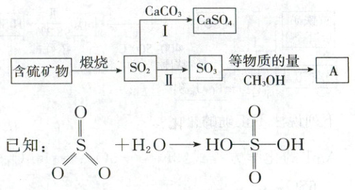 【流程分析】分析已知反应,反应前SO₃中有三个S=O键,产物硫酸中有两个S=O键,说明发生了加成反应。流程中含硫矿物指的是FeS₂,煅烧生成SO₂,产生的尾气经途径Ⅰ中CaCO₃脱硫后生成CaSO₄。途径Ⅱ中SO₂进一步转化为SO₃,与甲醇发生类似已知的加成反应,且SO₂与CH₃OH为等量反应,即: