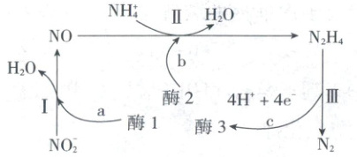 反应物 NO₂⁻+2H⁺+e⁻=NO+H₂O 中间产物 NH₄⁺+NO+2H⁺+3e⁻=N₂H₄+H₂O 产物
