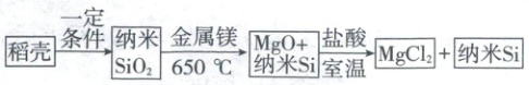 2.B 工艺微流程 SiO₂可与NaOH溶液发生反应SiO₂ + 2NaOH = Na₂SiO₃ + H₂O,A正确;MgO溶于盐酸生成MgCl₂为非氧化还原反应,盐酸体现酸性,B错误;高纯Si可用于制造太阳能电池,C正确;金属Mg与纳米SiO₂反应生成纳米Si的化学方程式为2Mg + SiO₂$\stackrel{650^{\circ}C}{=\!=\!=}$2MgO + Si,D正确。