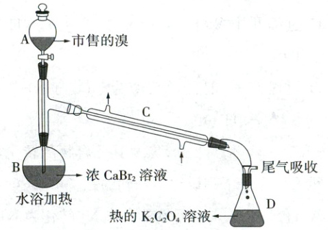 (1)该套装置为蒸馏装置,C为直形冷凝管;由于市售的溴中含有少量的$\mathrm{Cl_2}$,加入到浓$\mathrm{CaBr_2}$溶液中之后发生反应生成$\mathrm{Br_2}$,除去$\mathrm{Cl_2}$;蒸出的$\mathrm{Br_2}$经冷凝后进入D中,与$\mathrm{K_2C_2O_4}$发生氧化还原反应,$\mathrm{Br_2}$表现氧化性,$\mathrm{K_2C_2O_4}$表现还原性,发生的反应为$\mathrm{Br_2+K_2C_2O_4=2KBr+2CO_2↑}$。