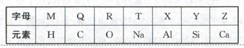 [元素辨析]钙霞石中所含原子序数依次增大的前20号主族元素M、Q、R、T、X、Y、Z中必然含有Ca元素,Ca为20号元素,所以Z为Ca元素;M是原子半径最小的元素,为H元素;Q是形成物质种类最多的元素(由于C的成键方式具有多样性,所以有机物的种类最多),为C元素;R是地壳中含量最高的元素,为O元素;T、X、Y同周期,且原子序数大于O,则同为第三周期元素,Q、X均与Y相邻,则可知Y与Q同主族,则Y为Si元素、X为Al元素;Z的原子序数等于M、R和T的原子序数之和,可得T的原子序数为$20 - 1 - 8 = 11$,则T为Na元素,汇总如下: