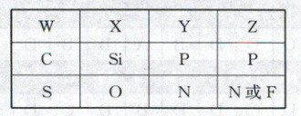 [元素辨析]非金属元素W原子中电子排布已充满的能级数与最高能级中的电子数相等,可得其可能为C($1s^{2}2s^{2}2p^{2}$)或S($1s^{2}2s^{2}2p^{6}3s^{2}3p^{4}$);X与W同族,则X为Si或O;Y与X相邻且Y原子比X原子多一个未成对电子,可知其为P($1s^{2}2s^{2}2p^{6}3s^{2}3p^{3}$)或N($1s^{2}2s^{2}2p^{3}$);Z位于W的对角线位置,则Z为P或N、F;汇总如下: