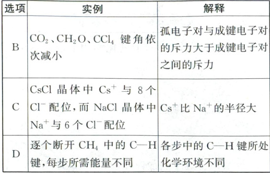 10.B 物质结构与性质 原子光谱是不连续的线状谱线,是由于原子的能级是量子化的,A正确;$CO_2$、$CH_2O$、$CCl_4$分子中心原子均为碳原子,中心原子上均无孤电子对,其杂化方式依次为$sp$、$sp^2$、$sp^3$,$CO_2$、$CH_2O$、$CCl_4$键角依次减小是由于中心原子杂化方式不同,B错误;一般来说,离子晶体中不同离子周围异电性离子数目的多少主要取决于阴、阳离子的相对大小,$Cs^+$半径大于$Na^+$,故$Cs^+$可吸引更多的$Cl^-$,C正确;逐断打开$CH_4$中$C—H$键的过程中,各步$C—H$键所处化学环境不同,故每步断开$C—H$键所需能量不同,D正确。