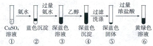 7.D 配合物 根据实验流程可推断②中沉淀是氢氧化铜,③④⑤中的深蓝色物质均为硫酸四氨合铜,⑥中溶液颜色为黄绿色,可判断其溶质为氯化铜和四氯合铜酸铵。③中生成 $[\mathrm{Cu(NH_3)_4}]^{2+}$,说明氨的配位能力更强,B正确;加入乙醇后硫酸四氨合铜结晶析出,说明其在乙醇中的溶解度更小,C正确;向⑤中加入稀硫酸,生成硫酸铜和硫酸铵,溶液呈蓝色而不是黄绿色,D错误。