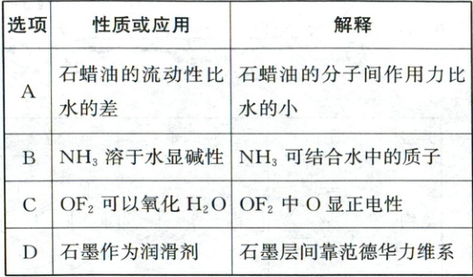 1.A 物质的结构与性质 分子间的作用力越大,物质的流动性越差,A错误;$\mathrm{NH_3}$ 结合水中的质子,使水分子释放 $\mathrm{OH^-}$,使溶液显碱性,B正确;电负性 $\mathrm{F}>\mathrm{O}$,故 $\mathrm{OF_2}$ 中 $\mathrm{O}$ 显正电性,具有强氧化性,可以氧化水生成 $\mathrm{O_2}$,C正确;石墨层间靠范德华力维系,作用力较弱,层间容易发生相对滑移,故可以作润滑剂,D正确。