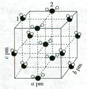 3.D 晶胞结构与性质 晶胞中 $\mathrm{SO_2}$ 位于棱心和体心,一个晶胞中 $\mathrm{SO_2}$ 的个数为 $12× \frac{1}{4} + 1 = 4$,则一个晶胞中含有 $8$ 个 $\mathrm{O}$ 原子,A错误;由晶胞图可知,晶胞中 $\mathrm{SO_2}$ 分子有两种取向,B错误;$1$ 号和 $2$ 号 $\mathrm{S}$ 原子间的核间距为顶面面心对角线的一半,顶面面心对角线长度为 $\sqrt{a^2 + b^2}\ \mathrm{pm}$,故 $1$ 号和 $2$ 号 $\mathrm{S}$ 原子间的核间距为 $\frac{1}{2}\sqrt{a^2 + b^2}\ \mathrm{pm}$,C错误;由于 $a \neq b \neq c$,故 $\mathrm{SO_2}$ 晶胞中体心 $\mathrm{S}$ 仅与 $4$ 个棱心 $\mathrm{S}$ 等距且紧邻,D正确。