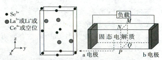 5. 【模块融合】(2025·云南卷,3分)${(Li_{0.45}La_{0.85})ScO_{3}}$是优良的固态电解质材料,${Ce^{4+}}$取代部分${La^{3+}}$后产生空位,可提升${Li^{+}}$传导性能。取代后材料的晶胞结构示意图(${O^{2-}}$未画出)及其作为电解质的电池装置如图所示。下列说法错误的是(