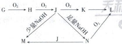 [思路分析]常温常压下J为无色气体,且具有漂白性,其所含元素发生连续氧化,则J为SO₂;常温常压下G为无色气体,可知为H₂S,H为S;SO₂分别与少量和足量NaOH反应,M为NaHSO₃,N为Na₂SO₃,Na₂SO₃被氧气氧化生成的L为Na₂SO₄。