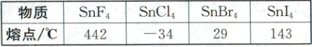 (4)$SnF_4$为离子晶体,影响其熔点的作用力为离子键,$SnCl_4$、$SnBr_4$、$SnI_4$为分子晶体,影响其熔点的作用力为分子间作用力,且相对分子质量越大,熔沸点越高。