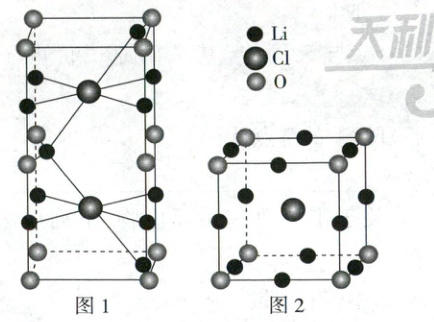 (6)①立方体形晶胞中含有1个$Cl$、1个$O$,根据化学式判断应该含有2个$Li$,因此位于棱心的锂离子是8个,缺位4个,总缺位率为$\frac{1}{3}$。同理该晶型中氯离子周围紧邻的锂离子平均数目为8。②长方体形晶胞中含有2个$Cl$、2个$O$、4个$Li$,质量是立方体形晶胞的2倍,二者密度近似相等,因此前者晶胞体积也是后者的2倍,即$abc = 2d^3$,$c=\frac{2d^3}{ab}$。