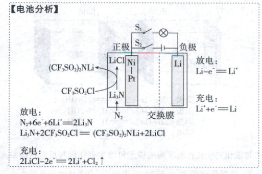 D.放电时总反应:${6Li + N_{2} + 4CF_{3}SO_{2}Cl\xlongequal{}2(CF_{3}SO_{2})_{2}NLi + 4LiCl}$