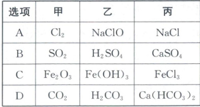 9.D 物质的转化 自然界中不存在氯气的转化,且氯气与水不生成次氯酸钠,A错误;二氧化硫与水生成亚硫酸而不是硫酸,B错误;氧化铁与水不发生反应,无法生成氢氧化铁,C错误。