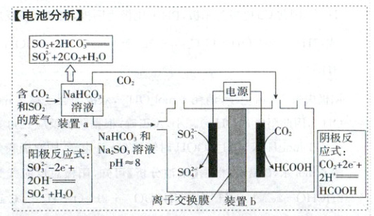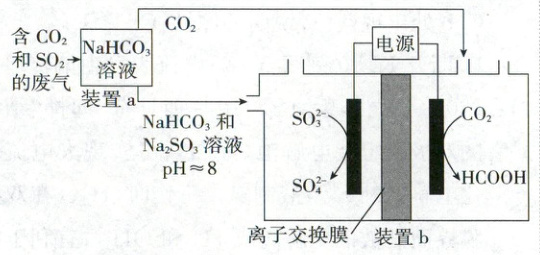 废气中$SO_2$排放到空气中会形成硫酸型酸雨,A正确;装置a中溶液的溶质为$NaHCO_3$,溶液显碱性,说明$HCO_3^-$的水解程度大于电离程度,B正确;装置a中$NaHCO_3$溶液的作用是吸收$SO_2$气体,$CO_2$与$NaHCO_3$溶液不反应,不能吸收$CO_2$,C错误;由电解池阴极和阳极反应式可知,装置b中总反应应为$SO_3^{2-}+CO_2+H_2O\stackrel{电解}{=\!=\!=}HCOOH+SO_4^{2-}$,D正确。